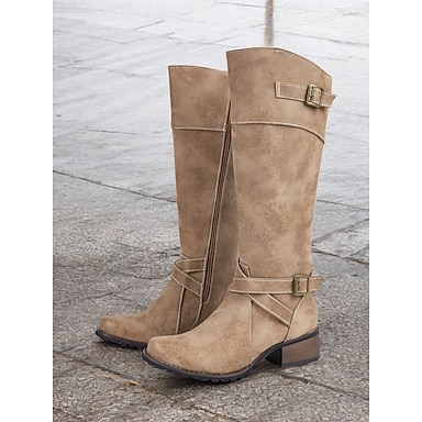 女性用タンニーハイ乗馬ブーツ - バックルディテール、ローヒール、頑丈なソールを備えたフェイクスエードで秋冬ファッションに最適