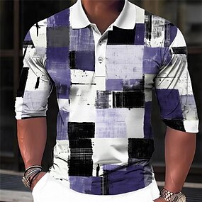 男性用 幾何学模様 ポロシャツ ゴルフシャツ 長袖 ポロシャツ 襟付きシャツ ビジネスカジュアル 作業服 フォーマルウェア フェスティバルウェア 3Dプリント ボタン 秋冬 ワイン ブルー パープル