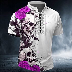 Halloween 男性用 スカル ローズ ヘンリーシャツ Tシャツティー 半袖 Tシャツ 3Dプリント クルーネック レースアップネック ヘンリー シャツ ファッション 日常 ベーシック ストリート スポーツ・アウトドア カジュアル ルビーレッド ブルー パープル 夏 春 オールシーズン 衣類 S M L XL XXL 3XL