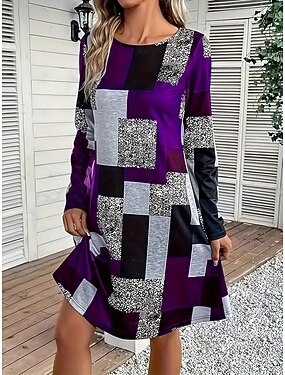 女性用 ミニドレス シースドレス A ラインドレス フィット&フレアドレス パーティー カジュアル ボヘミアン パーティー 結婚式のゲスト 日常 レギュラー グラフィック 幾何学模様 チェック 長袖 クルーネック ブルー パープル グリーン グレー 春 秋 冬