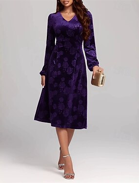 女性用 ミディドレス ベルベットドレス 二次会ドレス / カクテルドレス エレガント ファッション 近代の アウトドア パーティー パーティーイブニングウェア レギュラー フラワー 平織り 長袖 Vネック ルビーレッド パープル グリーン 春 秋
