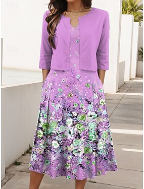 女性用 ドレスセット サマードレス カジュアル フォーマル フラワー グラフィック 多層式 プリント ミディドレス 七分袖 クルーネック 日常 祝日 ブルー パープル オレンジ 夏 春 レギュラー