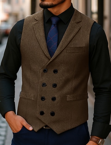男性用 ベスト チョッキ バケーション 日常 ウェディングパーティー デート ヴィンテージ ファッション 春 秋 ポケット ボタン ポリエステル ツイード 快適 平織り ヘリンボーン ダブルブレスト ノッチドラペル レギュラー バーガンディー コーヒー グレー ベスト
