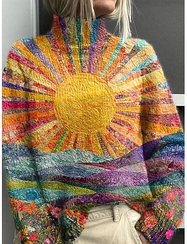 女性用 プルオーバー 旅行度假风 日常 幾何学模様 カラーブロック リブ タートルネック プリント 長袖 レギュラートップス ニット アウトドア 日常 祝日 イエロー パープル 秋 冬