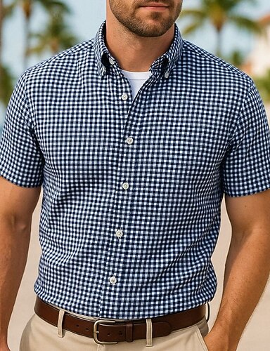 男性用 サマーシャツ カジュアルシャツ ビーチシャツ ボタンアップシャツ ブラック ピンク ダークネイビー 半袖 格子柄 ラペル バケーション ハワイアン ボタンダウン 衣類 ポリエステル ファッション カジュアル 快適
