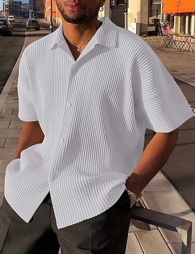 男性用 サマーシャツ カジュアルシャツ ビーチシャツ ボタンアップシャツ ホワイト 半袖 平織り 垂直ストリップ ラペル バケーション 祝日 ボタンダウン 衣類 ポリエステル ファッション カジュアル 快適