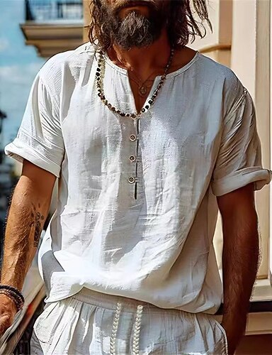 男性用 シャツ ポップオーバー シャツ サマーシャツ カジュアルシャツ ビーチシャツ ブラック ホワイト ピンク グリーン カーキ色 長袖 平織り Band Collar バケーション ハワイアン ボタンダウン 衣類 ファッション カジュアル 快適