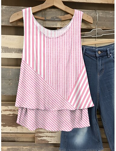 女性用 キャミソールタンクトップ グラフィック ストライプ エレガント ロマンチック カジュアル ノースリーブ Vネック レギュラートップス 日常 パッチワーク プリント ピンク ブルー パープル グリーン 夏 春