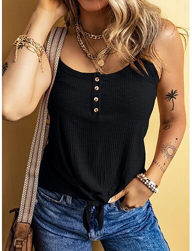 女性用 キャミソールタンクトップ 純色 日常 スタイリッシュ カジュアル ノースリーブ スクープネック レギュラートップス 日常 ボタン ブラック イエロー アーミーグリーン アプリコット 夏 春