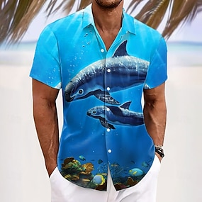 男性用 動物 鯨 シャツ ボタンアップシャツ デザイナーシャツ 半袖 ヴィンテージレトロ バケーション カジュアル 夏 春 折襟 3Dプリント 襟付きシャツ ブルー