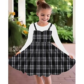 女子 3D チェック ドレス 長袖 夏 春 バケーション 日常 祝日 プリンセス 美しい 甘い 子供 4〜12年 カジュアルドレス A ラインドレス 膝丈 レギュラー