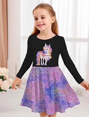 女子 3D グラフィック ユニコーン ドレス 長袖 夏 春 バケーション 日常 祝日 プリンセス 美しい 甘い 子供 4〜12年 カジュアルドレス A ラインドレス 膝丈 レギュラー