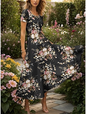 女性用 マキシドレス カジュアルドレス A ラインドレス サマードレス エレガント 旅行度假风 カジュアル レギュラー フラワー グラフィック 半袖 スクエアネック ルビーレッド ブルー パープル 夏