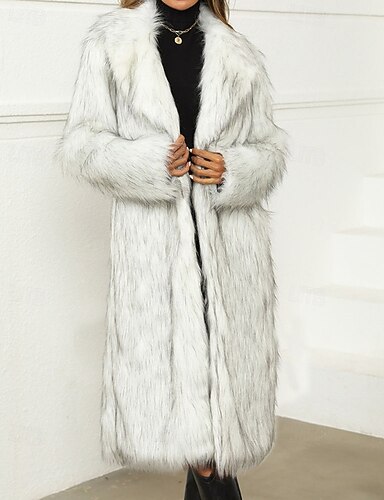 女性用 コート フェイクファーコート 保温 快適 ボタン オープンフロント 毛皮と革製品 エレガント カジュアル 平織り バケーション ストリート カジュアル デイリーウェア ロング 折襟 レギュラー 長袖 アウターウェア ホワイト 秋 冬