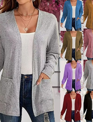 女性用 ニット カーディガン ファッション ストリートファッション カジュアル 純色 オープンフロント ニット 長袖 レギュラートップス ニット 日常 祝日 お出かけ カーキ色 秋 冬