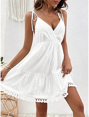 女性用 ミニドレス 白いドレス スイングドレス サマードレス 自由奔放に生きるドレス ストリートファッション マキシ丈 ベーシック バケーション ストリート 祝日 レギュラー ハーフスリーブ Vネック ホワイト 夏