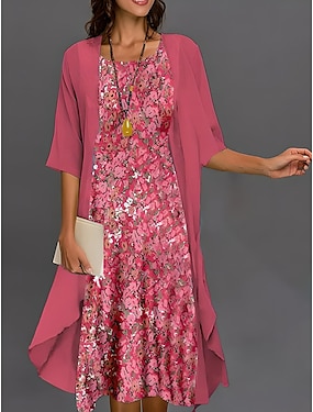 女子の卒業式ドレス ミディドレス シフォン ドレス シフトドレス 夏のドレス エレガント スタイリッシュ フォーマルフォーマル ウェディングゲスト デイリー ルーズフィット フローラルグラフィック 半袖 クルーネック ピンク 夏 春 秋