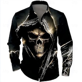 Halloween 男性用 スカル 死 シャツ ボタンアップシャツ 長袖 ダークパンクゴシック アウトドア 祝日 夏 春 折襟 3Dプリント 襟付きシャツ ブラック