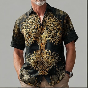 男性用 命の木 シャツ サマーシャツ ボタンアップシャツ 半袖 ヴィンテージレトロ 日常着 祝日 夏 春 折襟 3Dプリント 襟付きシャツ ブルー ゴールド グリーン グレー