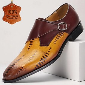 フォーマルな場やビジネスミーティングに最適な、パンチング加工が施されたメンズプレミアムレザーモンクストラップドレスシューズ