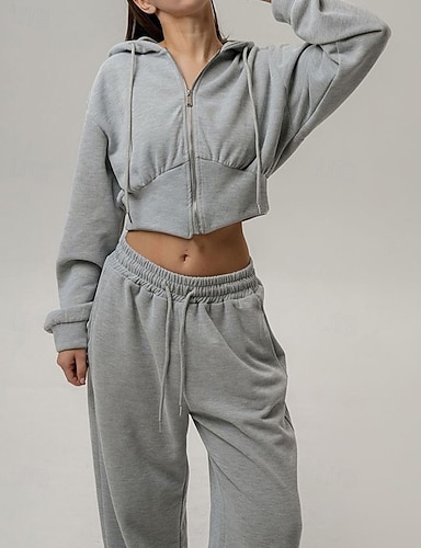 女性用 活発的 ストリートファッション パンツセット ボレロトップ 長袖 フード付き 平織り ドローストリング ジッパー アウトドア バケーション 日常 ブラック ネービーブルー グレー 秋 レギュラー