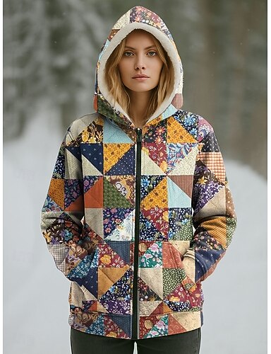 女性用 冬物コート フリースの上着 カジュアルジャケット 保温 ジッパー ポケット プリント ファッション カジュアル 幾何学模様 ストリート カジュアル レギュラー フード付き レギュラー 長袖 アウターウェア イエロー ブルー パープル 春 秋