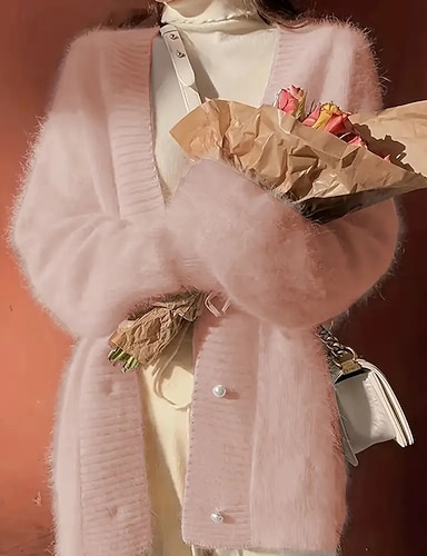 女性用 カーディガン エレガント ファッション 日常 純色 ファジー クルーネック ニット 長袖 レギュラートップス ニット ワーク ピンク ベージュ 秋 冬