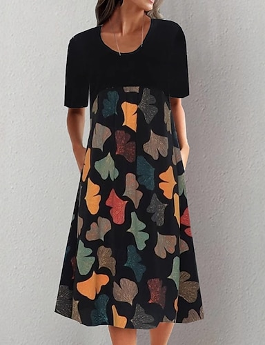 女性用 ミディドレス プリントドレス クラシック アウトドア バケーション お出かけ レギュラー フラワー 半袖 クルーネック ブラック 夏