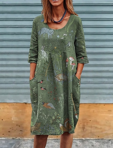 女性用 ミディドレス カジュアルドレス サマードレス ファッション 近代の 日常 ビーチ 週末 レギュラー 動物 フラワー ハーフスリーブ クルーネック グリーン 春 秋