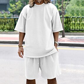 男性用 Tシャツスーツ 2 ピースの衣装 ティー&ショーツ 半袖 クルーネック 夏 平織り ファッション カジュアル 2個 バケーション デイリーウェア お出かけ ブラック ホワイト メンズトップTシャツ