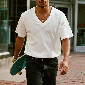 男性用 ティートップ コットンブレンドTシャツ 半袖 Vネック 夏 オールシーズン 純色 平織り デザイナー ベーシック 現代コンテンポラリー Vネック バケーション ストリート カジュアル ブラック ホワイト メンズトップTシャツ