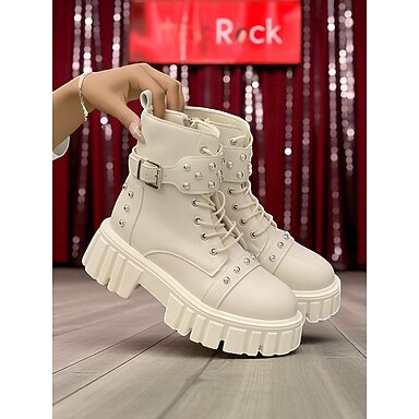 レディースのホワイトプラットフォームコンバットブーツ、バックルストラップ付きのレースアップメッシュパネルハイアンクルブーツ、ナイトライフやパーティールックに最適なエッジの効いたストリートウェアスタイル