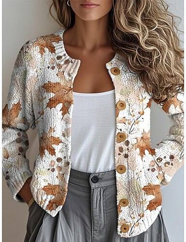 女性用 カーディガン ファッション 日常 カジュアル フラワー グラフィック リブ クルーネック ボタン プリント 長袖 レギュラートップス ニット アウトドア 日常 デート キャメル 秋 冬
