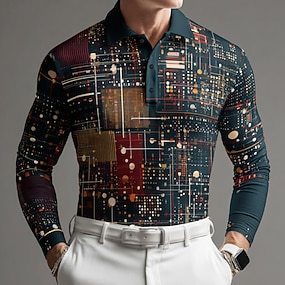 男性用 幾何学的な ゴルフ ポロ 長袖 ポロシャツ ラペル カジュアル アスレイジャー デイリーウェア 3Dプリント ボタン 春 秋 冬 ブラック ホワイト