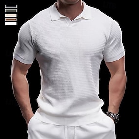 男性用 ゴルフシャツ ワッフルニットポロシャツ ビジネス 活発的 クラシック 半袖 ファッション 近代の 純色 花 ボタン ポケット 夏 春 レギュラー ブラック ホワイト ブルー ベージュ グレー ゴルフシャツ