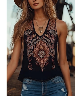 女性用 キャミソールタンクトップ フラワー グラフィック ボヘミア 日常 エスニック ノースリーブ Vネック レギュラートップス 日常 祝日 お出かけ ブラック 夏 春