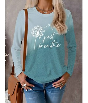 レディース Tシャツ クルーネック 長袖 チュニック レター ダンデライオン モダン カジュアル レギュラー トップス デイリー ウィークエンドプリント ブルー 秋 冬