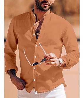 男性用 シャツ リネンシャツ ポップオーバー シャツ サマーシャツ ビーチウェア ボタンダウンシャツ 純色 バケーション ストリート ブラック ホワイト ブルー カーキ色 長袖 スタンド 夏 春 衣類