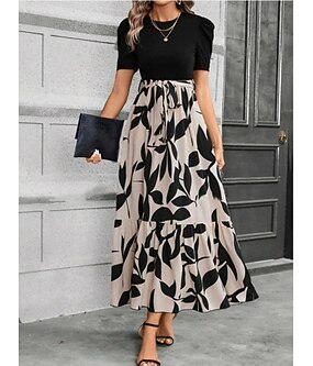 女性用 マキシドレス A ラインドレス エレガント スタイリッシュ ワーク 日常 レギュラー カラーブロック 半袖 クルーネック ブラック 夏