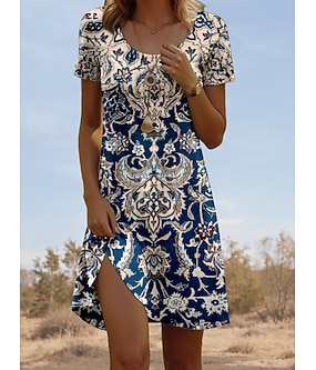 女性用 ミニドレス カジュアルドレス ヴィンテージ カジュアル 日常 レギュラー 幾何学模様 カラーブロック 半袖 クルーネック ワイン ブルー グリーン グレー 夏