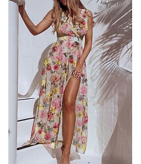 女性用 ロングドレス マキシドレス カジュアルドレス スイングドレス A ラインドレス サマードレス ハワイアン マキシ丈 ボヘミアン バケーション ストリート 祝日 レギュラー フラワー ノースリーブ Vネック イエロー ピンク グリーン ライトブルー 夏