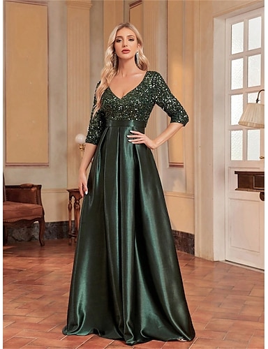 Aライン イブニングドレス パーティー フォーマルドレス パーティー フロア丈 七分袖 Vネック スパンコール とともに スパンコール 2025