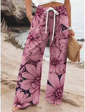 女性用 ワイドレッグ パンツ 旅行度假风 カジュアル ロング丈 ハイウエスト フラワー 弾性ウエスト プリント ハイカット 通気性 ソフト マイクロエラスティック バケーション ストリート デイリーウェア フクシャ 春 秋 レギュラー