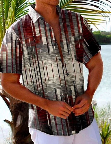 男性用 幾何学模様 カラーブロック ストライプ シャツ ボタンアップシャツ 半袖 ファッションカジュアル バケーション ストリートウェア ビーチウェア 夏 秋 折襟 3Dプリント 襟付きシャツ フロントポケット1つ グレー