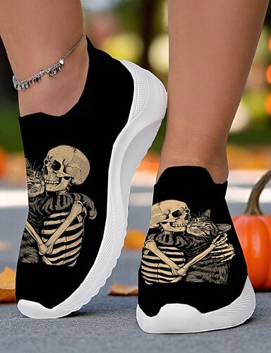 レディース パープル フライニット スニーカー - ハロウィンの黒猫プリント 軽量ウォーキングシューズ カジュアルアウトドアウェア