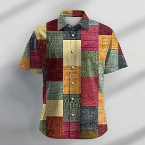 男性用 幾何学模様 カラーブロック パッチワーク シャツ カジュアルシャツ ボタンアップシャツ 半袖 ファッションカジュアル バケーション 日常着 祝日 夏 春 折襟 3Dプリント 襟付きシャツ フロントポケット1つ ルビーレッド ブルー グリーン グレー