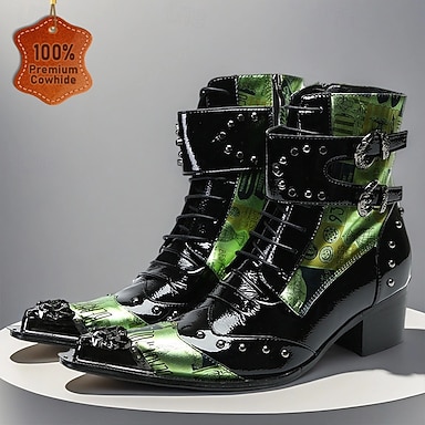 男性用 ブーツ バイカーブーツ レトロ風 フィットネス ウォーキング レザー エナメル イタリア製フルグレイン牛革 快適 すべり止め ウォーム ミドルブーツ ファスナー ローファー バックルは含まれません グリーンブラック 春 秋 冬