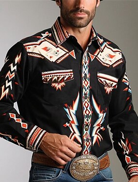 男性用 ジオメトリ ウエスタンシャツ カウボーイシャツ 長袖 ヴィンテージ 洋式 デイリーウェア お出かけ 週末 春 折襟 ポケット プリント ボタンダウン ブラック ネイビーブルー ブラウン グリーン