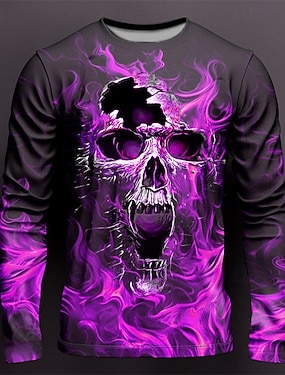 男性用 グラフィック 火炎 スカル Tシャツ 長袖 Tシャツ 3Dプリント クルーネック シャツ ファッション デザイナー カジュアル スポーツ・アウトドア 祝日 お出かけ ディープパープル イエロー パープル 春 & 秋 衣類 S M L XL 2XL 3XL 4XL