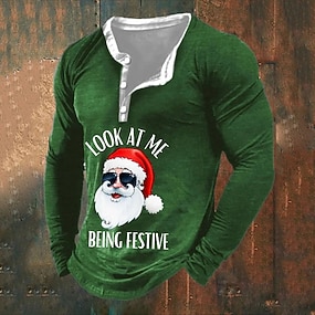 クリスマス メンズ サンタクロース ヘンリー Tシャツ ヘンリー Tシャツ グラフィック サンタクロース ヘンリー 海 ブルー グリーン ブラック ブルー パープル 3D プリント アウトドア 長袖 パッチワーク ボタンダウン 衣類 アパレル ベーシック